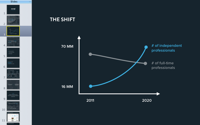 Because ooomf is a vetted network of mobile and Web independent professionals where the professionals pick their work, we thought one of the strongest parts of our presentation was the opportunity in our market. The economic shift toward independent, remote work is happening now and is expected to only accelerate over the coming years.