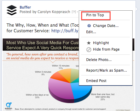For crucial info, current offers or simply a post you really want to be seen, try pinning. A pinned post is an update that you manually select to stay at the top of your Timeline even as you add other posts to your page.