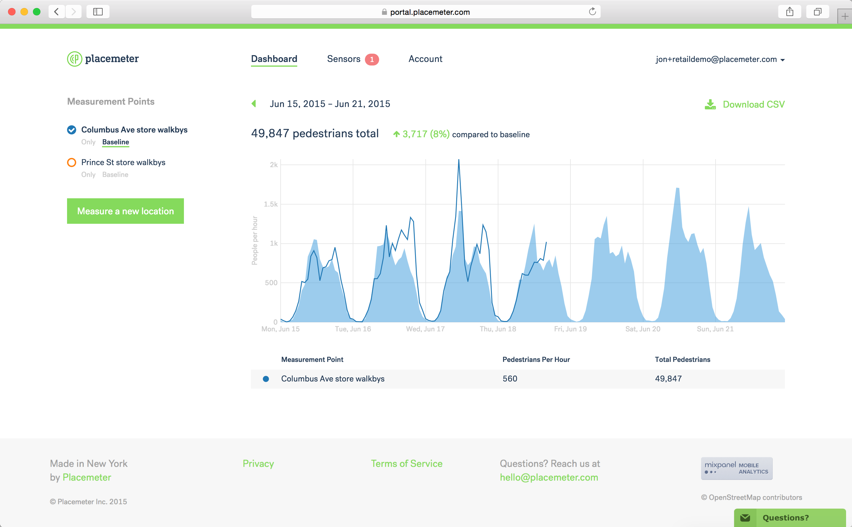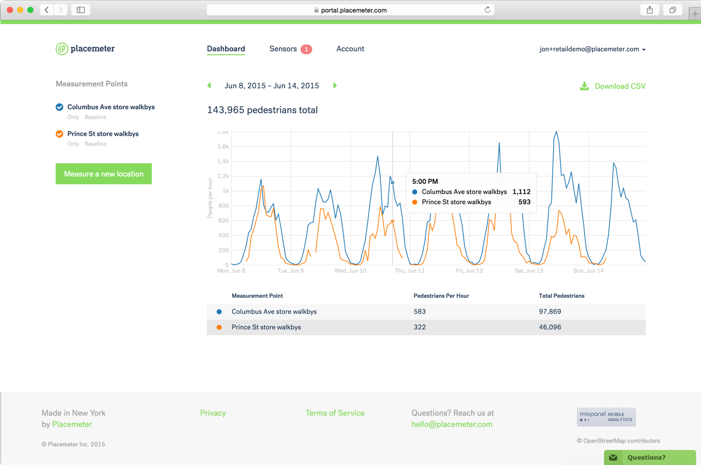From there, customers can get the granular data they want to know; how many slowed to peek through the windows, or turned left down a busy side-street? Placemeter also tags individuals by noting how they’re dressed, so retailers can get a better idea of things like how long a customer stays in a store; it’s Placemeter’s method for monitoring individuals without using intrusive method like facial recognition.