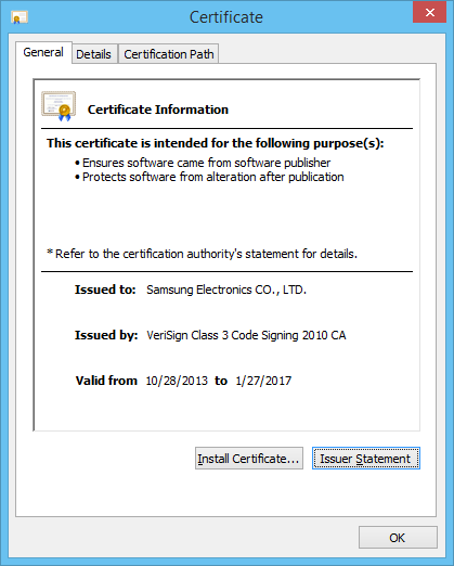 Disable_Windowsupdate.exe is signed with Samsung’s security certificate, confirming the company did create it.