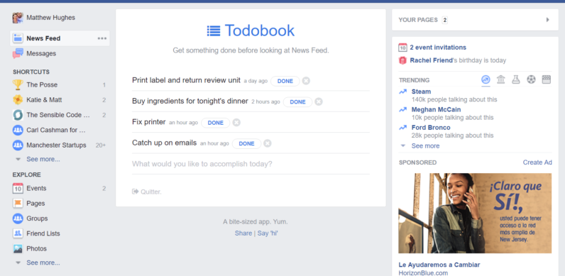 Every morning, without fail, the first website I visit is Facebook. I instinctively gravitate to the News Feed. I want to see what my friends around the world are up to. I need to see every photo. Every update. This is just what it’s like to use the Internet in 2017. But admittedly, this isn’t the most productive use of one’s time. It’s easy to fall into a black hole, where you’re just scrolling and clicking, liking and arguing. Which is why Todobook is so cool. Before you see your friends’ posts, you’ll instead see your to-do list, thereby focusing…