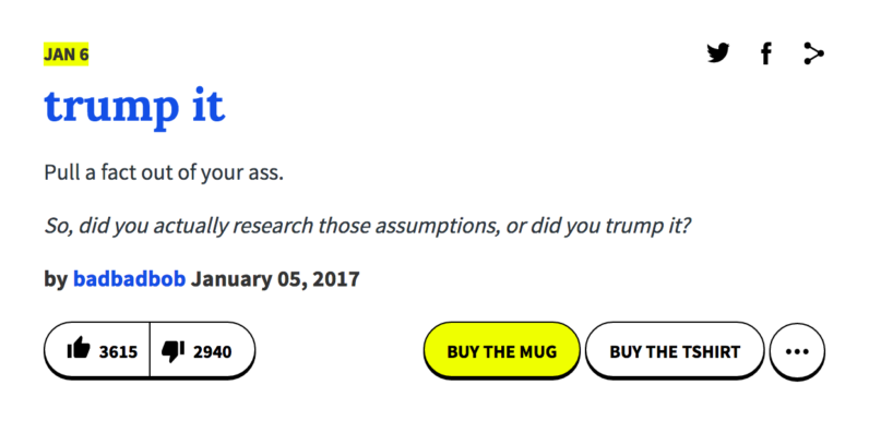 Remember back to the campaign when Donald Trump famously said: “I’m very highly educated. I know words; I have the best words.”? Well, just in case, here it is. He wrapped up that back patting session with this: “But there’s no better word than stupid.” We disagree. Urban Dictionary has some pretty great words too, and some of them bear Trump’s name, or were created out of thin air in his honor. Let’s take a look at some of the words we might be seeing more of over the next four years — all from Urban Dictionary. Bigly Big-lee When you’re running…