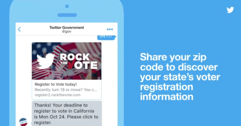 To celebrate National Voter Registration Day, Twitter has announced a new feature that makes it it easier than ever for US residents to register to vote in the presidential election. Starting today, when a Twitter user sends a Direct Message to the official @Gov account with their five-digit zip code, they’ll receive an automated response with their state’s voter registration deadline and a personalized link to register. Through a Direct Message with @Gov, Twitter can help you find your state’s voter registration deadline and register to vote. pic.twitter.com/ySh2elJgY6 — Twitter Government (@gov) September 27, 2016 As we get closer to Election…